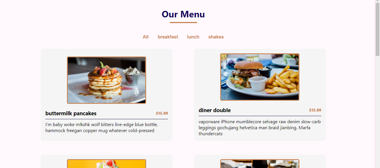 Created a Food Menu app using HTML, CSS, JavaScript, React JS. The site allows users to filter breakfasts, lunch and dinner.