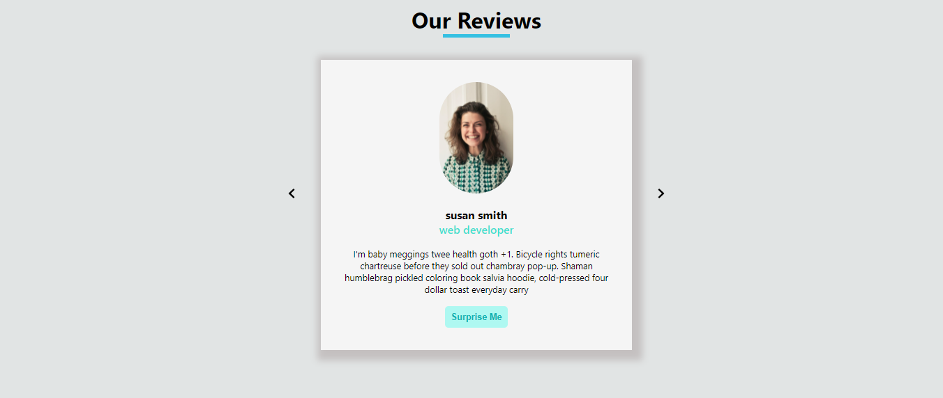 Created a user review card, using HTML, CSS, JavaScript, React JS. The site loads review of each person for every 2 secon..
