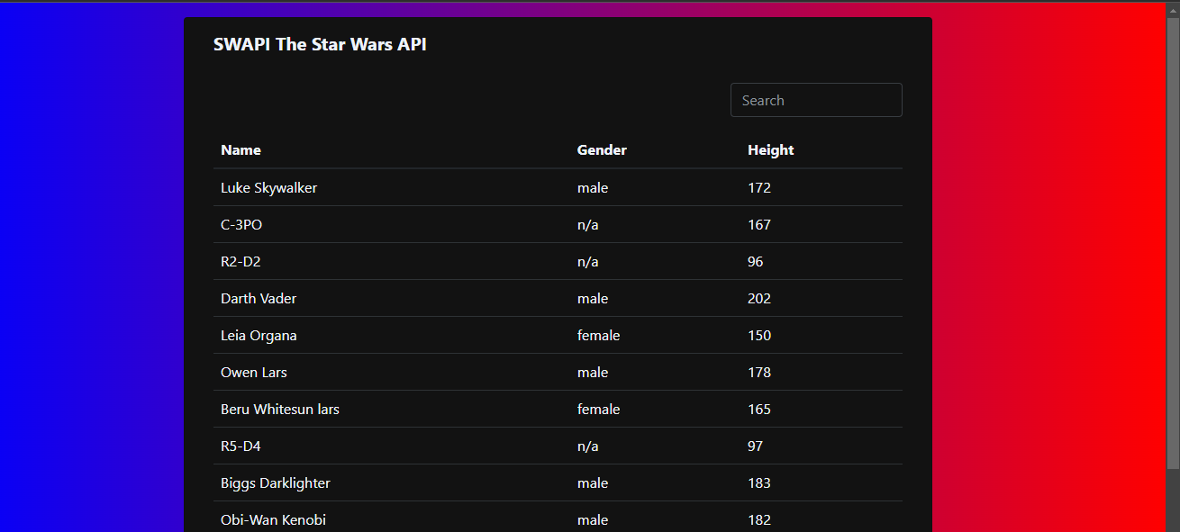 Displayed Star Wars Cast details with a paginated and search functionality. onClick it opens up a model with more..